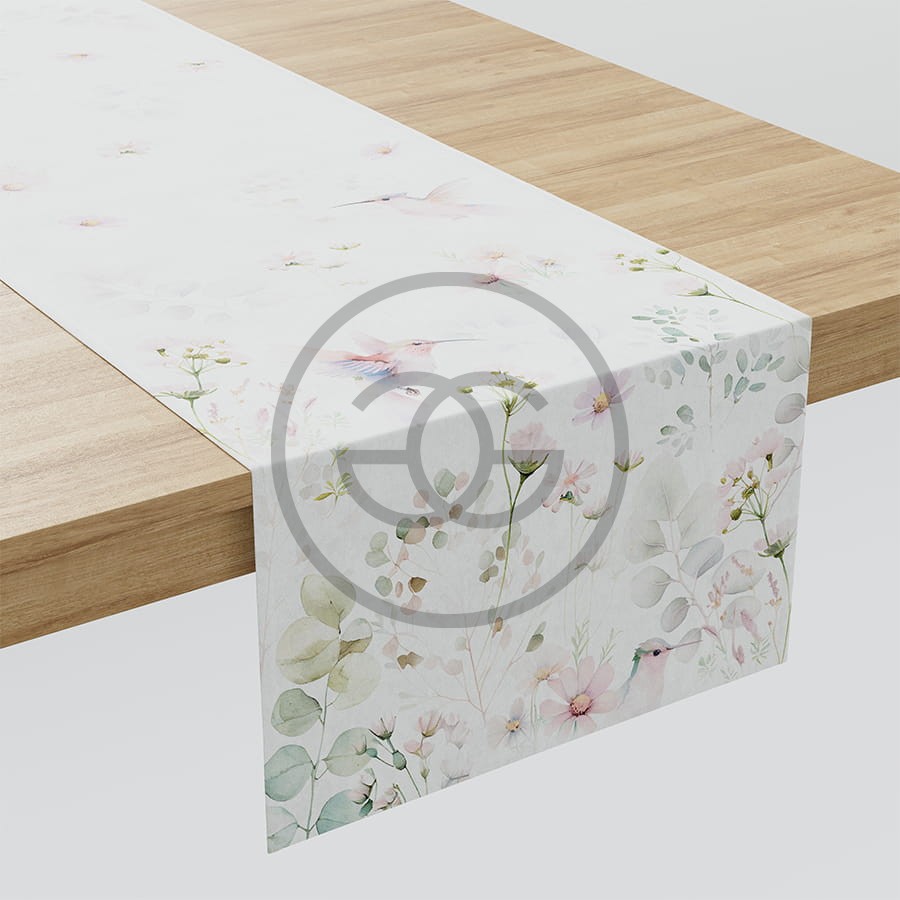 Bieżnik na białym tle z delikatnym motywem kwiatowym, które oplatają brzegi bieżnika. Bieżnik Polina świetnie sprawdzi się w nowoczesnym wnętrzu Twojego mieszkania, jak i w ogrodzie na spotkaniu przy grillu.